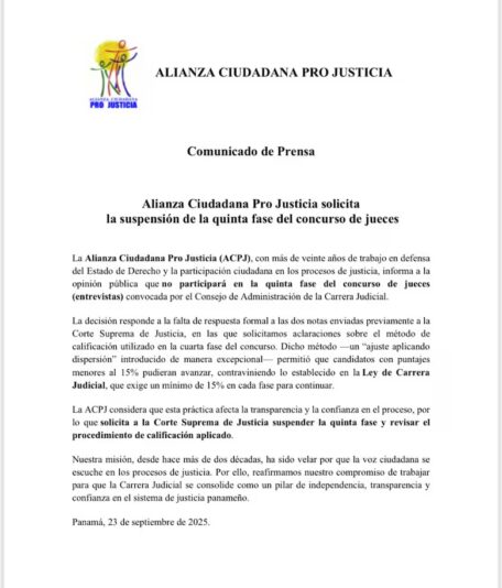 La Alianza Ciudadana Pro Justicia anunció este martes 23 de septiembre que no participará en la quinta fase del concurso de jueces que adelanta el Órgano Judicial. La organización, que cuenta con más de 20 años de trabajo en la defensa del Estado de derecho y la promoción de la participación ciudadana, justificó su decisión en la falta de transparencia detectada en el proceso de selección.