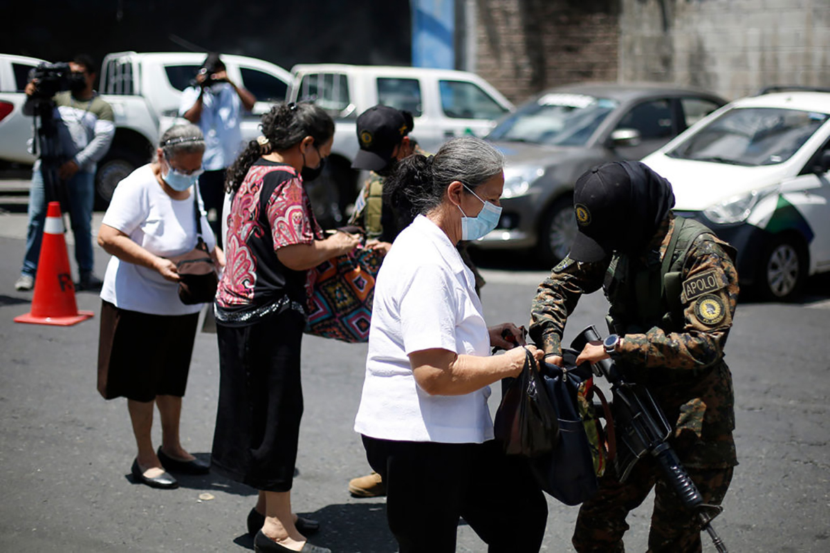 AME6952. SANTA TECLA (EL SALVADOR), 28/03/2022.- Soldados requisan hoy las pertenencias de varias personas en un punto de control en Santa Tecla (El Salvador). Las autoridades de El Salvador realizaron capturas masivas de supuestos pandilleros en respuesta a la escalada de homicidios que se ha cobrado la vida de 87 personas el fin de semana y que llevó al Congreso a decretar un estado de excepción a solicitud del presidente Nayib Bukele. EFE/Rodrigo Sura