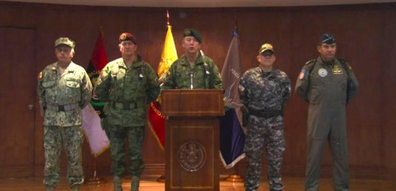 El jefe del Comando Conjunto de las Fuerzas Armadas (Comaco) de Ecuador, Nelson Proaño, emitió un comunicado en video tras el anuncio del presidente Guillermo Lasso de invocar la ‘muerte cruzada’ para disolver la Asamblea Nacional y convocar a elecciones anticipadas. Proaño aseguró que tanto las Fuerzas Armadas como la Policía Nacional mantendrán una postura inalterable de absoluto respeto a la Constitución y las leyes del país.