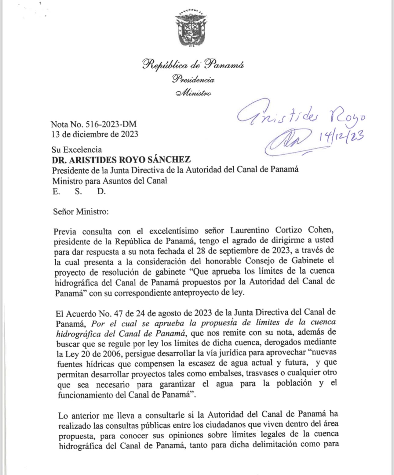José Simpson Polo, ministro de la Presidencia, envió una carta al presidente de la Junta Directiva de la Autoridad del Canal de Panamá, Arístides Royo, para obtener detalles sobre la realización de consultas a los ciudadanos que residen dentro del área de la cuenca hidrográfica del Canal. Este cuestionamiento surge en relación con la posible construcción de nuevos embalses en dicha área.