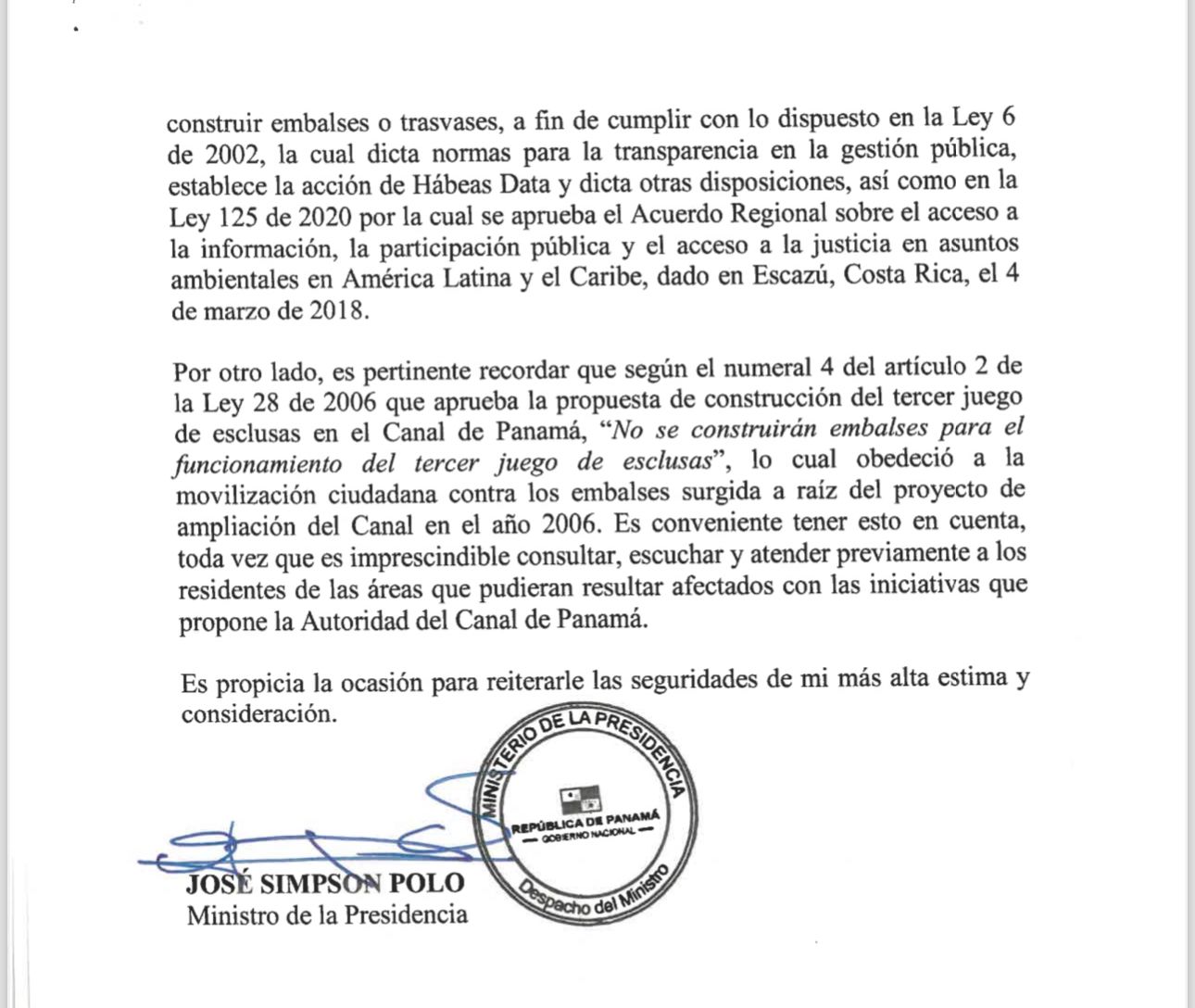 Ministro de la Presidencia solicita información sobre consulta ciudadana para nuevos embalses en la cuenca del Canal José Simpson Polo, ministro de la Presidencia, envió una carta al presidente de la Junta Directiva de la