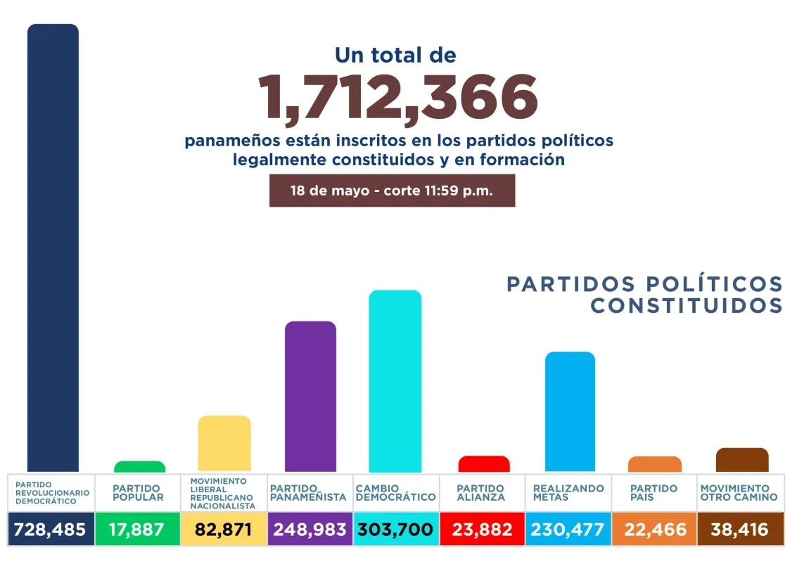 Entre los partidos políticos legalmente constituidos, el Partido Revolucionario Democrático (PRD) encabeza la lista con un total de 728,485 inscritos, seguido por Cambio Democrático (CD) con 303,700, el Partido Panameñista con 248,983, Realizando Metas (RM) con 230,477 y el Movimiento Liberal Republicano Nacionalista (Molirena) con 82,871 afiliados.