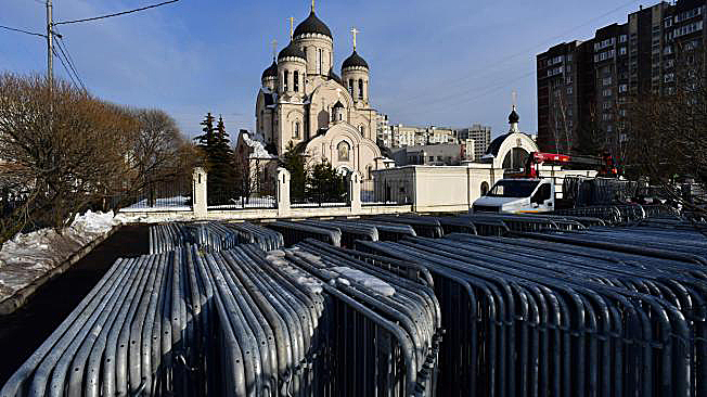 Frente a la iglesia donde se celebrará la ceremonia fúnebre de Alexei Navalny, se organizan vallas metálicas de control de multitudes.